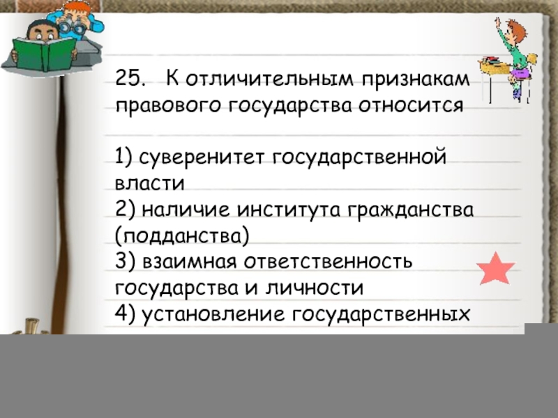 Слайд 8725. К отличительным признакам правового государства относится