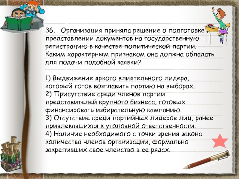4) Наличие необходимого с точки зрения закона количества членов организации, формально закрепивших свое членство в ее рядах.