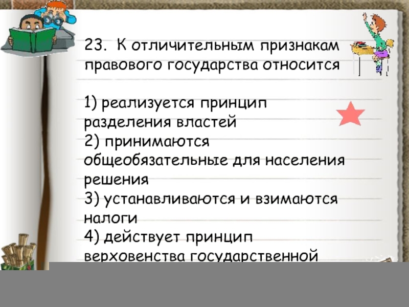 Слайд 8624. К отличительным признакам правового государства относится