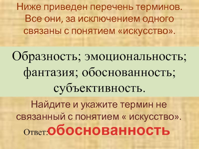 Найдите и укажите термин не связанный с понятием « искусство».