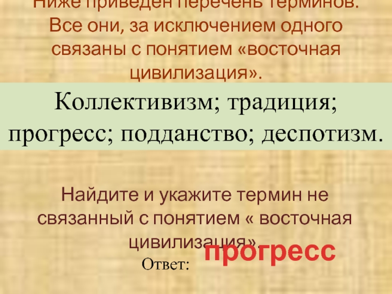 Найдите и укажите термин не связанный с понятием « восточная цивилизация».