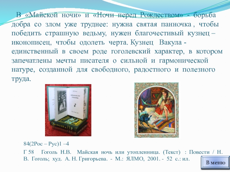 Г 58   Гоголь Н.В.  Майская ночь или утопленница. (Текст)  : Повести / Н.В. Гоголь; худ. А. Н. Григорьева. - М.: ЯЛМО, 2001. - 52 с.: ил.