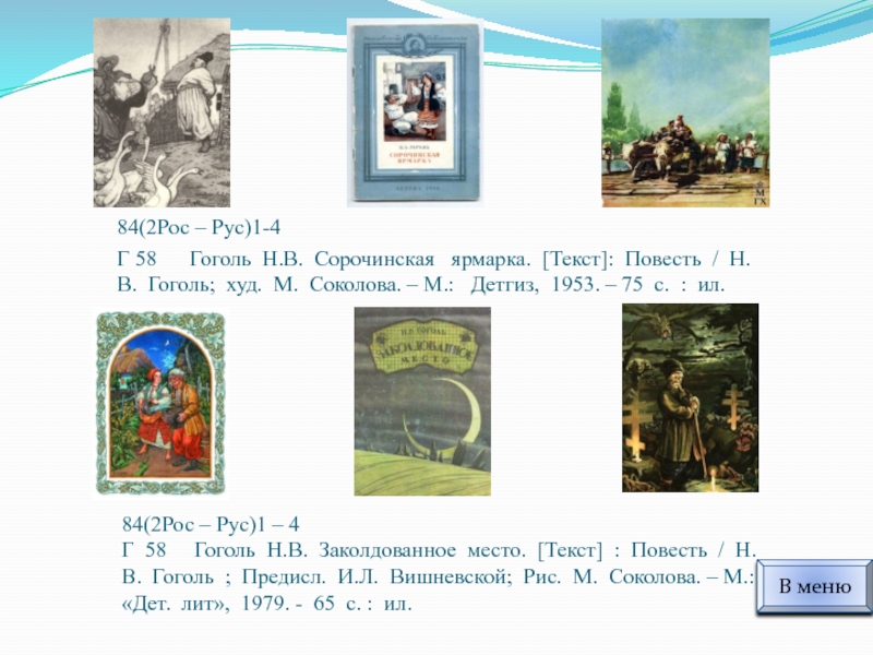 Г 58   Гоголь Н.В. Заколдованное место. [Текст] : Повесть / Н.В. Гоголь ; Предисл. И.Л. Вишневской; Рис. М. Соколова. – М.: «Дет. лит», 1979. - 65 с. : ил.