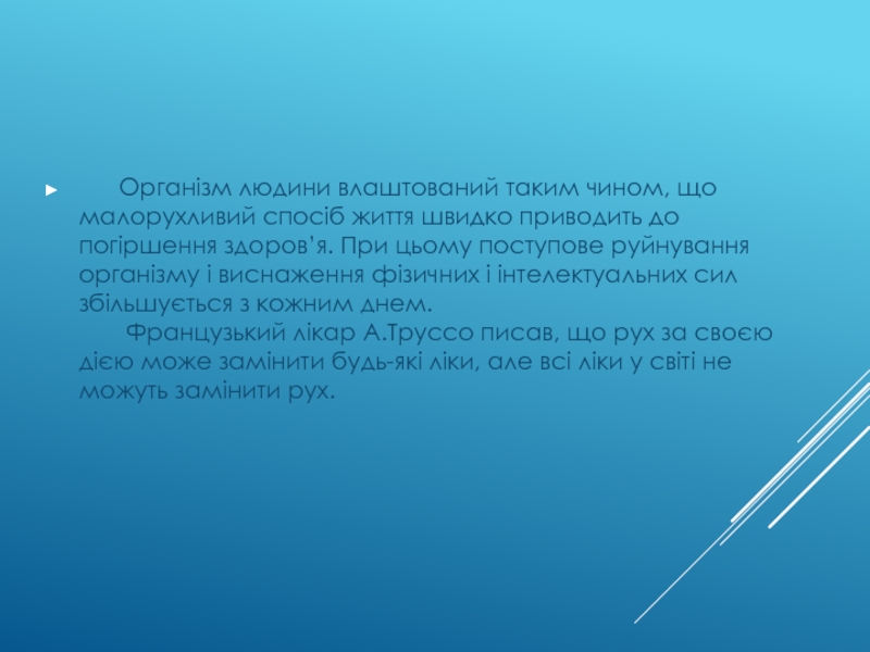 Французький лiкар А.Труссо писав, що рух за своєю дiєю може замiнити будь-якi лiки, але всi лiки у свiтi не можуть замiнити рух.