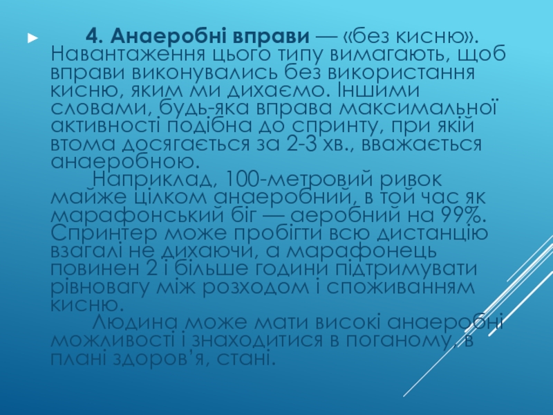 Слайд 8 4. Анаеробнi вправи — «без кисню». Навантаження цього типу вимагають, щоб