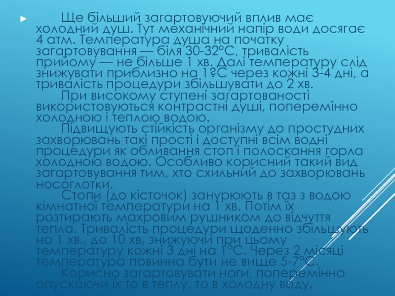 води досягає 4 атм. Температура душа на початку загартовування — бiля 30-32°С, тривалiсть прийому — не бiльше 1 хв. Далi температуру слiд знижувати приблизно на 1?С через кожнi 3-4 днi, а тривалiсть процедури збiльшувати до 2 хв.