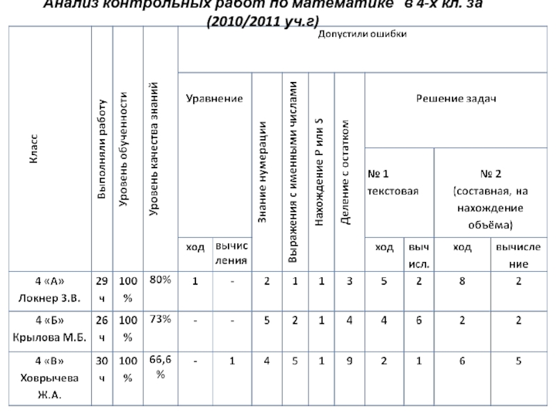 Слайд 7Анализ контрольных работ по математике в 4-х кл. за (2010/2011