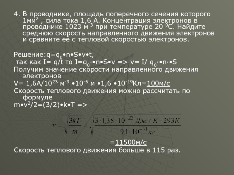 1,6 А. Концентрация электронов в проводнике 1023 м-3 при температуре 20 0С. Найдите среднюю скорость направленного движения электронов и сравните её с тепловой скоростью электронов.