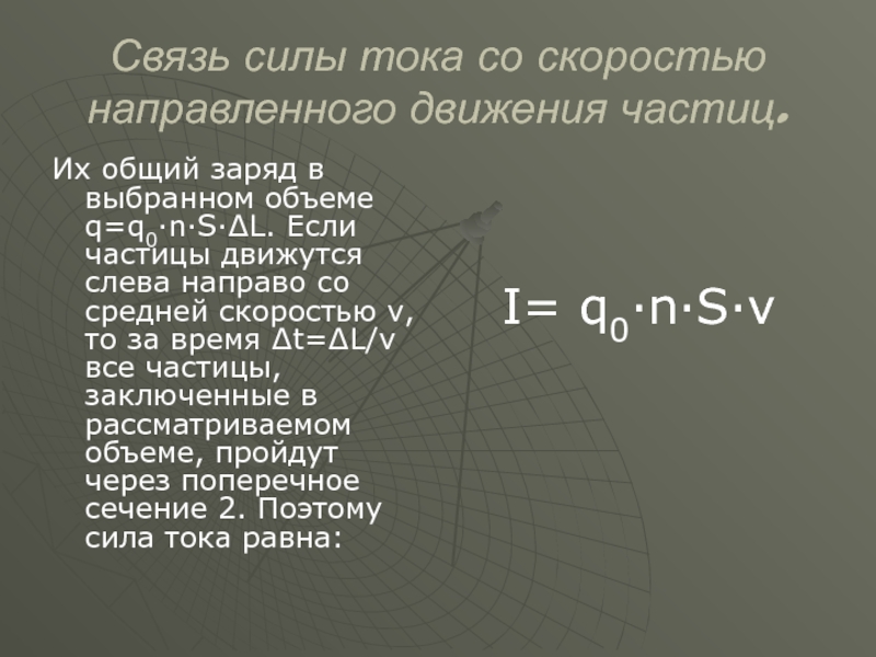 выбранном объеме q=q0·n·S·∆L. Если частицы движутся слева направо со средней скоростью v, то за время ∆t=∆L/v все частицы, заключенные в рассматриваемом объеме, пройдут через поперечное сечение 2. Поэтому сила тока равна: