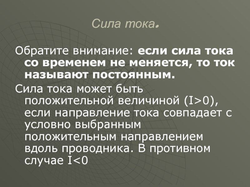 Сила тока может быть положительной величиной (I>0), если направление тока совпадает с условно выбранным положительным направлением вдоль проводника. В противном случае I<0