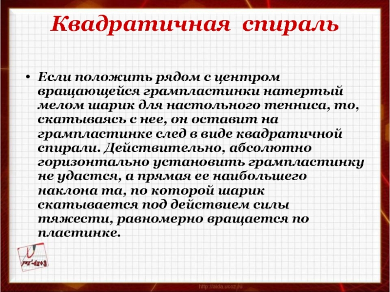 для настольного тенниса, то, скатываясь с нее, он оставит на грампластинке след в виде квадратичной спирали. Действительно, абсолютно горизонтально установить грампластинку не удастся, а прямая ее наибольшего наклона та, по которой шарик скатывается под действием силы тяжести, равномерно вращается по пластинке.