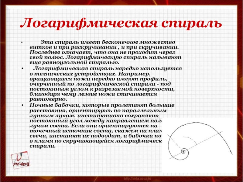 , и при скручивании. Последнее означает, что она не проходит через свой полюс. Логарифмическую спираль называют еще равноугольной спиралью.