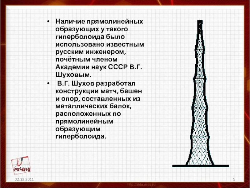 В.Г. Шухов разработал конструкции матч, башен и опор, составленных из металлических балок, расположенных по прямолинейным образующим гиперболоида.