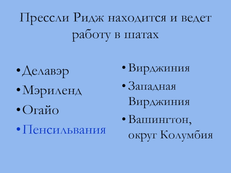 Слайд 8Прессли Ридж находится и ведет работу в шатах