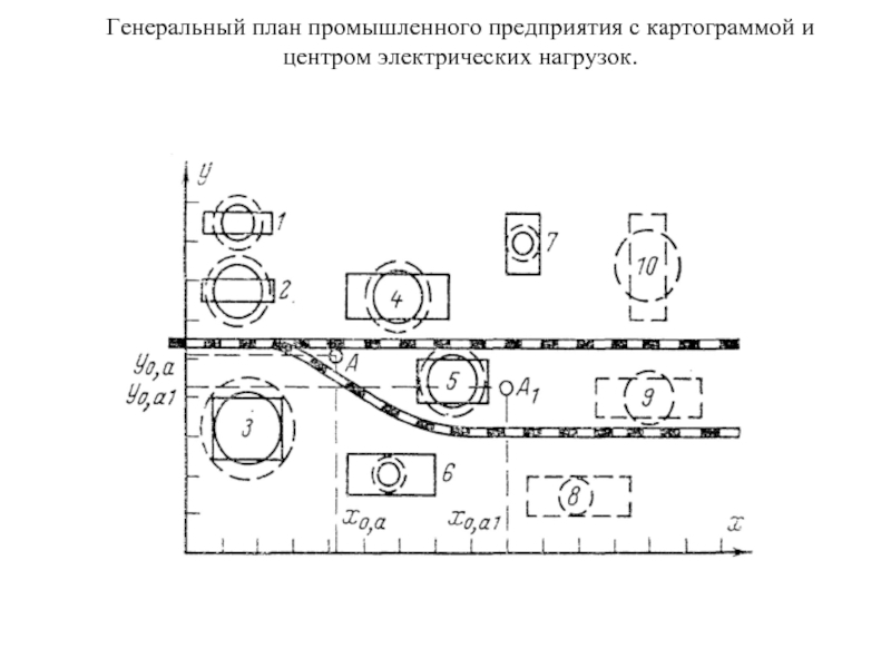Слайд 5Генеральный план промышленного предприятия с картограммой и центром электрических нагрузок.