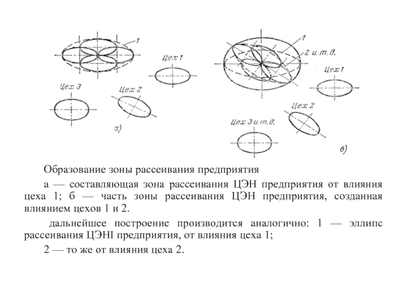 дальнейшее построение производится аналогично: 1 — эллипс рассеивания ЦЭНI предприятия, от влияния цеха 1;