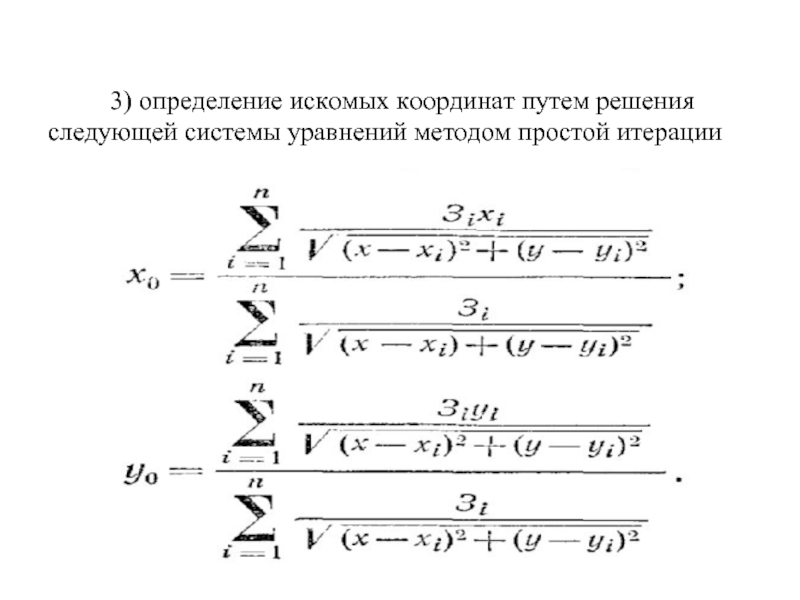 3) определение искомых координат путем решения следующей системы уравнений методом простой