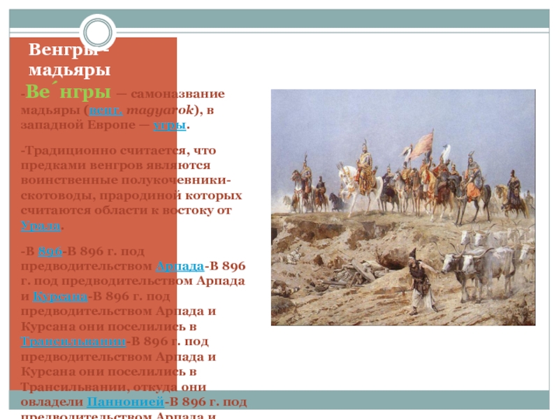 -В 896-В 896 г. под предводительством Арпада-В 896 г. под предводительством Арпада и Курсана-В 896 г. под предводительством Арпада и Курсана они поселились в Трансильвании-В 896 г. под предводительством Арпада и Курсана они поселились в Трансильвании, откуда они овладели Паннонией-В 896 г. под предводительством Арпада и Курсана они поселились в Трансильвании, откуда они овладели Паннонией и впоследствии заняли сегодняшние земли восточной Австрии-В 896 г. под предводительством Арпада и Курсана они поселились в Трансильвании, откуда они овладели Паннонией и впоследствии заняли сегодняшние земли восточной Австрии и южной Словакии. Венгры совершали набеги на Западную Европу.