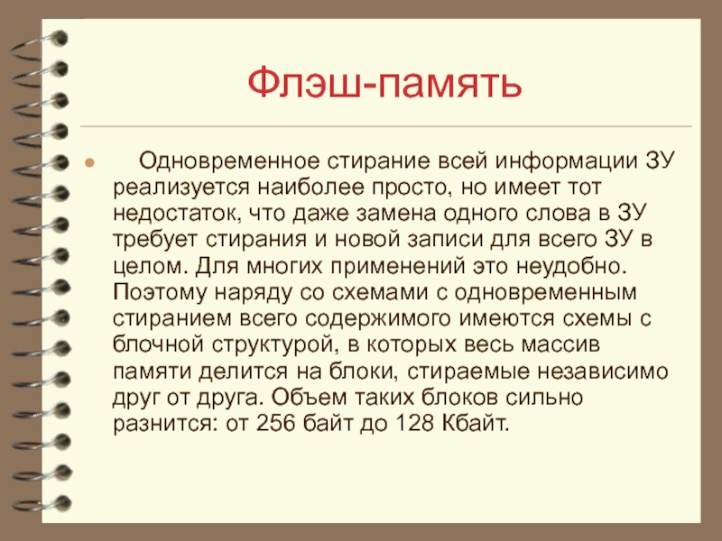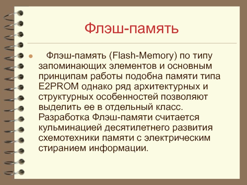 принципам работы подобна памяти типа Е2РROМ однако ряд архитектурных и структурных особенностей позволяют выделить ее в отдельный класс. Разработка Флэш-памяти считается кульминацией десятилетнего развития схемотехники памяти с электрическим стиранием информации.