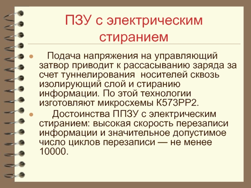 Достоинства ППЗУ с электрическим стиранием: высокая скорость перезаписи информации и значительное допустимое число циклов перезаписи — не менее 10000.