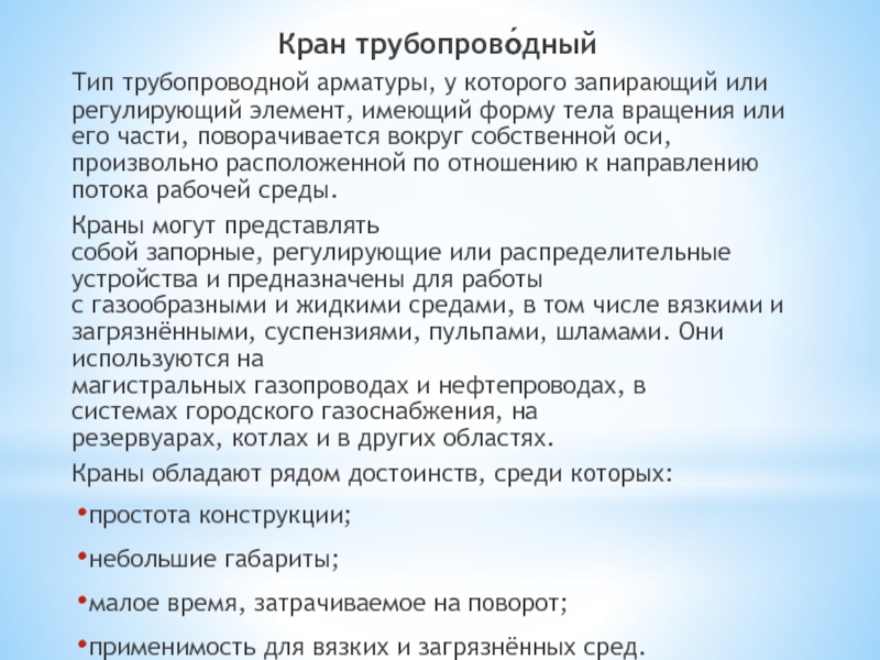 Краны могут представлять собой запорные, регулирующие или распределительные устройства и предназначены для работы с газообразными и жидкими средами, в том числе вязкими и загрязнёнными, суспензиями, пульпами, шламами. Они используются на магистральных газопроводах и нефтепроводах, в системах городского газоснабжения, на резервуарах, котлах и в других областях.
