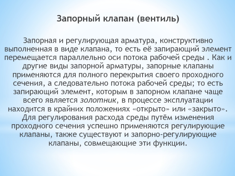 элемент перемещается параллельно оси потока рабочей среды . Как и другие виды запорной арматуры, запорные клапаны применяются для полного перекрытия своего проходного сечения, а следовательно потока рабочей среды; то есть запирающий элемент, которым в запорном клапане чаще всего является золотник, в процессе эксплуатации находится в крайних положениях «открыто» или «закрыто». Для регулирования расхода среды путём изменения проходного сечения успешно применяются регулирующие клапаны, также существуют и запорно-регулирующие клапаны, совмещающие эти функции.