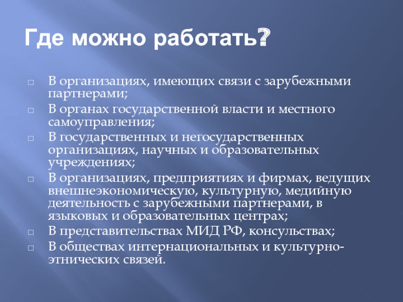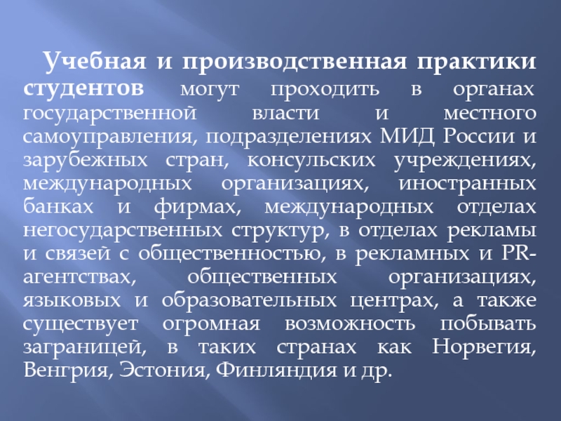 и местного самоуправления, подразделениях МИД России и зарубежных стран, консульских учреждениях, международных организациях, иностранных банках и фирмах, международных отделах негосударственных структур, в отделах рекламы и связей с общественностью, в рекламных и PR-агентствах, общественных организациях, языковых и образовательных центрах, а также существует огромная возможность побывать заграницей, в таких странах как Норвегия, Венгрия, Эстония, Финляндия и др.