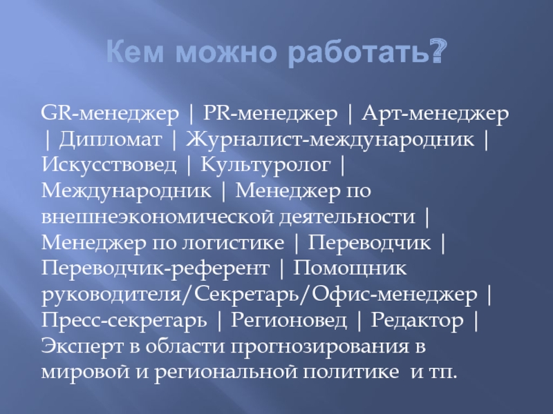 | Искусствовед | Культуролог | Международник | Менеджер по внешнеэкономической деятельности | Менеджер по логистике | Переводчик | Переводчик-референт | Помощник руководителя/Секретарь/Офис-менеджер | Пресс-секретарь | Регионовед | Редактор | Эксперт в области прогнозирования в мировой и региональной политике и тп.