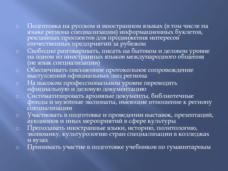 региона специализации) информационных буклетов, рекламных проспектов для продвижения интересов отечественных предприятий за рубежом