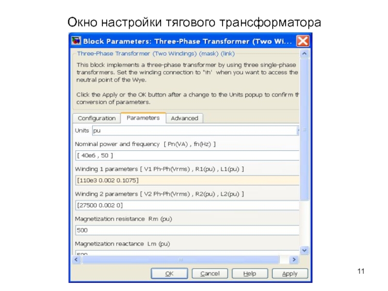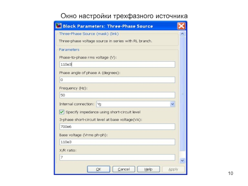 Настройка параметров модели в среде SimPowerSystems Matlab