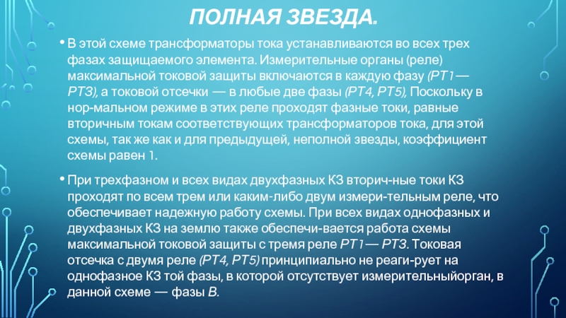 полная звезда — трехфазная двух-, трех- или четырехрелейная схема, применяется для защиты электрических сетей напряжением 110 кВ и выше, работающих с глухозаземленной нейтралью и с большими токами КЗ на землю;