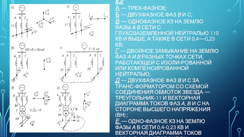 Слайд 12ВИДЫ КОРОТКИХ ЗАМЫКАНИЙ И ВЕКТОРНЫЕ ДИАГРАММЫ ТОКОВ КЗ: