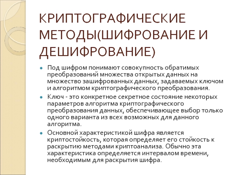 Слайд 5КРИПТОГРАФИЧЕСКИЕ МЕТОДЫ(ШИФРОВАНИЕ И ДЕШИФРОВАНИЕ)