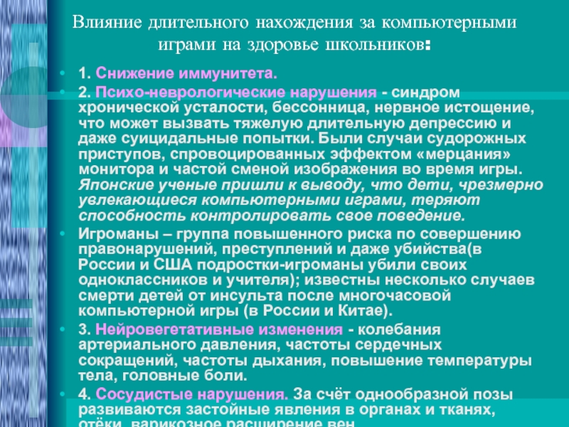 2. Психо-неврологические нарушения - синдром хронической усталости, бессонница, нервное истощение, что может вызвать тяжелую длительную депрессию и даже суицидальные попытки. Были случаи судорожных приступов, спровоцированных эффектом «мерцания» монитора и частой сменой изображения во время игры. Японские ученые пришли к выводу, что дети, чрезмерно увлекающиеся компьютерными играми, теряют способность контролировать свое поведение.