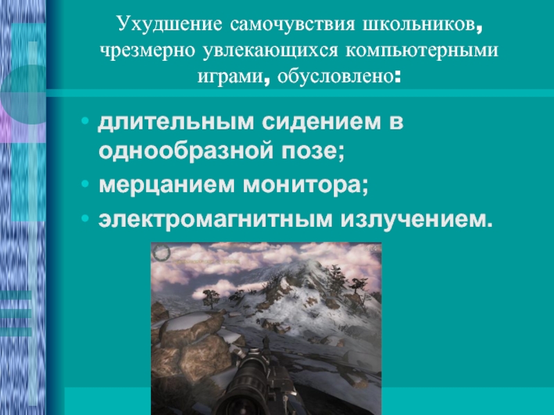 Слайд 16Ухудшение самочувствия школьников, чрезмерно увлекающихся компьютерными играми, обусловлено: