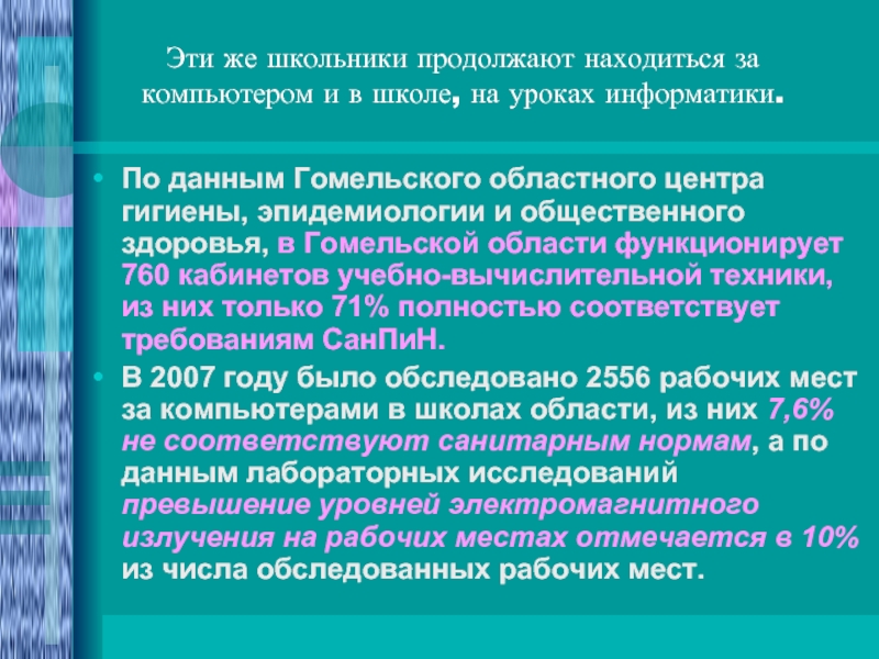 В 2007 году было обследовано 2556 рабочих мест за компьютерами в школах области, из них 7,6% не соответствуют санитарным нормам, а по данным лабораторных исследований превышение уровней электромагнитного излучения на рабочих местах отмечается в 10% из числа обследованных рабочих мест.