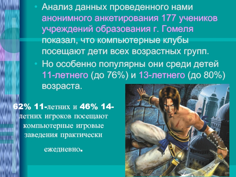 Анализ данных проведенного нами анонимного анкетирования 177 учеников учреждений образования г. Гомеля показал, что компьютерные клубы посещают дети всех возрастных групп.