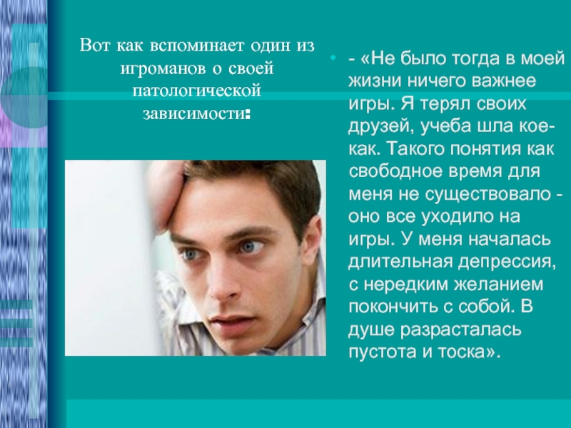 Слайд 20Вот как вспоминает один из игроманов о своей патологической зависимости: