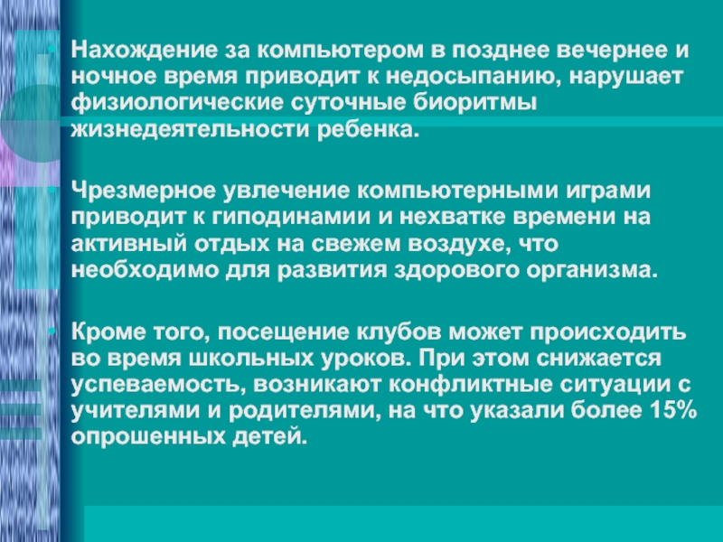 Чрезмерное увлечение компьютерными играми приводит к гиподинамии и нехватке времени на активный отдых на свежем воздухе, что необходимо для развития здорового организма.