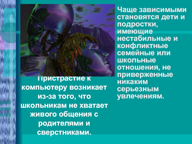 Слайд 14Пристрастие к компьютеру возникает из-за того, что школьникам не хватает живого