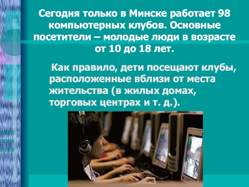 Слайд 4Сегодня только в Минске работает 98 компьютерных клубов. Основные посетители –