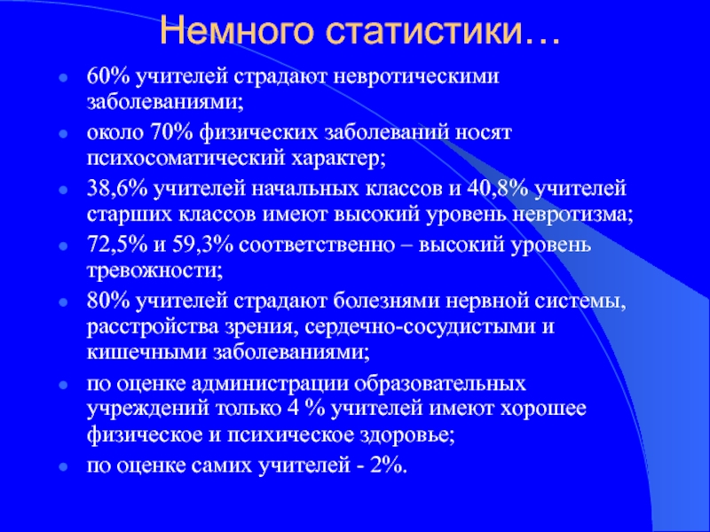 по оценке администрации образовательных учреждений только 4 % учителей имеют хорошее физическое и психическое здоровье;