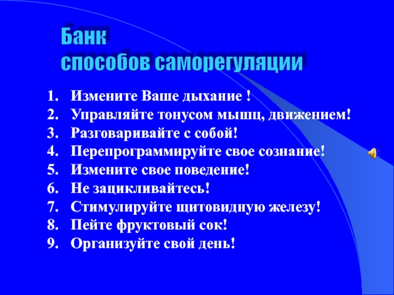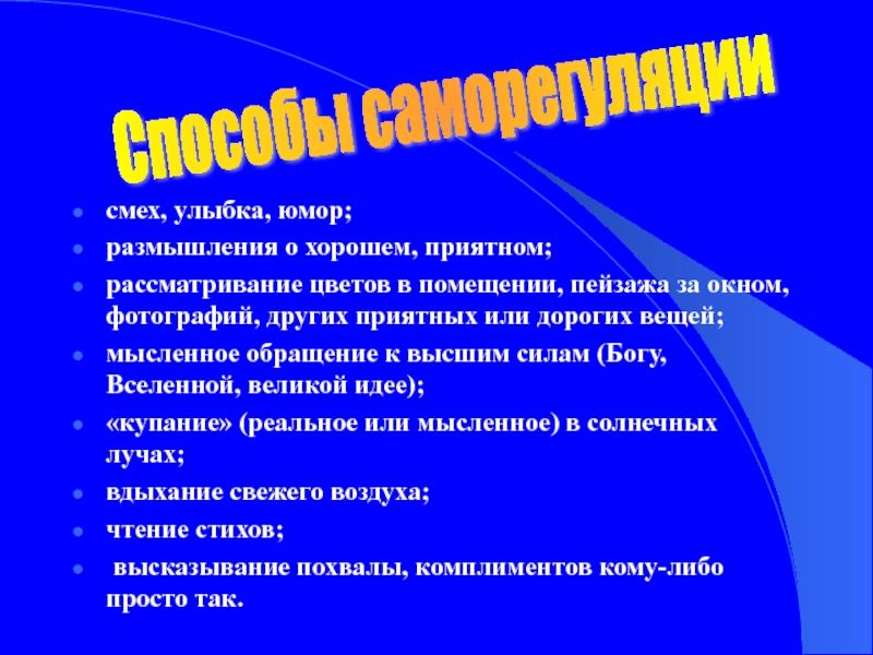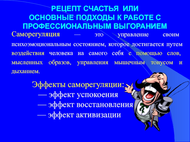 это управление своим психоэмоциональным состоянием, которое достигается путем воздействия человека на самого себя с помощью слов, мысленных образов, управления мышечным тонусом и дыханием.