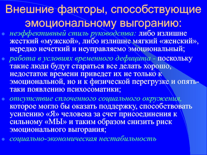 Слайд 10Внешние факторы, способствующие эмоциональному выгоранию: