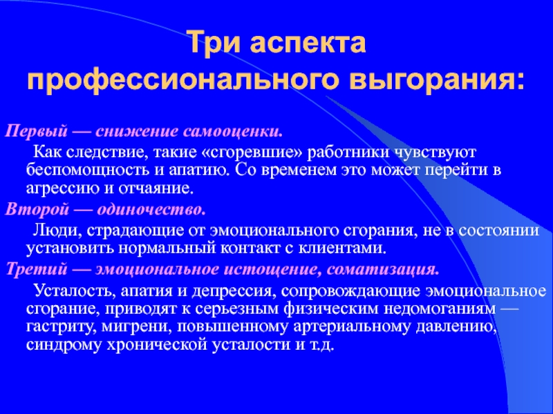Усталость, апатия и депрессия, сопровождающие эмоциональное сгорание, приводят к серьезным физическим недомоганиям — гастриту, мигрени, повышенному артериальному давлению, синдрому хронической усталости и т.д.
