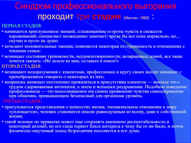 Слайд 15Синдром профессионального выгорания проходит три стадии (Маслач, 1982) :