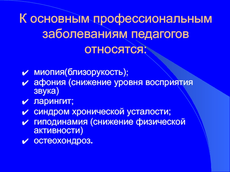 Слайд 4К основным профессиональным заболеваниям педагогов относятся: