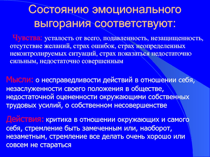 Слайд 9Состоянию эмоционального выгорания соответствуют: