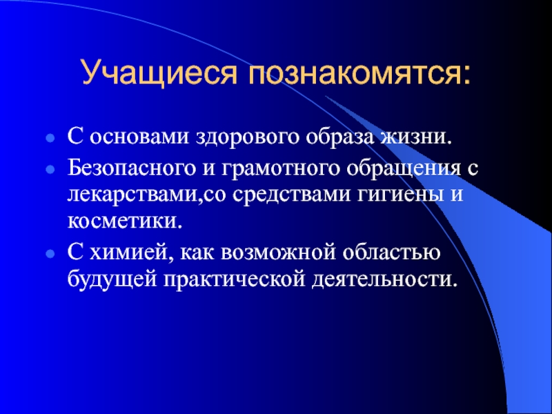 ПОЗНАКОМИТЬ С СОСТАВОМ И СВОЙСТВАМИ ХИМИЧЕСКИХ ВЕЩЕСТВ, ОБРАЗУЮЩИХ ЛЕКАРСТВЕННЫЕ ПРЕПАРАТЫ,СРЕДСТВА ГИГИЕНЫ И КОСМЕТИКИ.