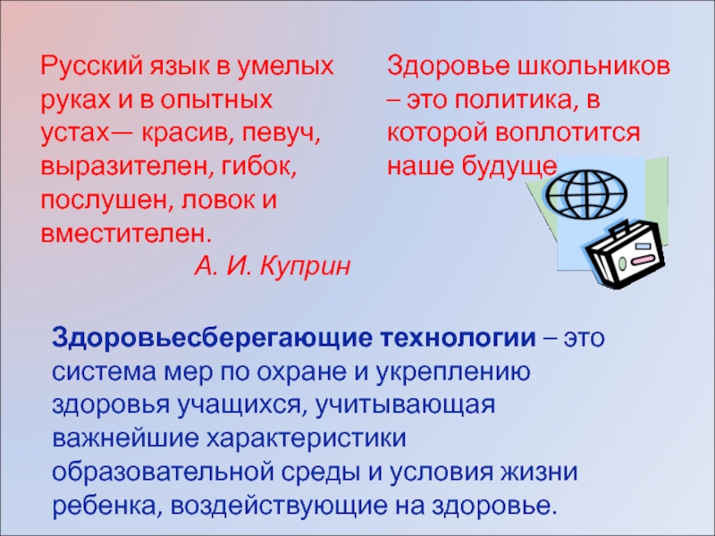 Здоровьесберегающие технологии – это система мер по охране и укреплению здоровья учащихся, учитывающая важнейшие характеристики образовательной среды и условия жизни ребенка, воздействующие на здоровье.